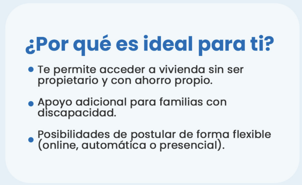 Es una ayuda económica destinada a familias que no son propietarias y han logrado ahorrar. Permite adquirir una vivienda nueva o usada de hasta 1.100 UF (o 1.200 UF en zonas extremas del país).