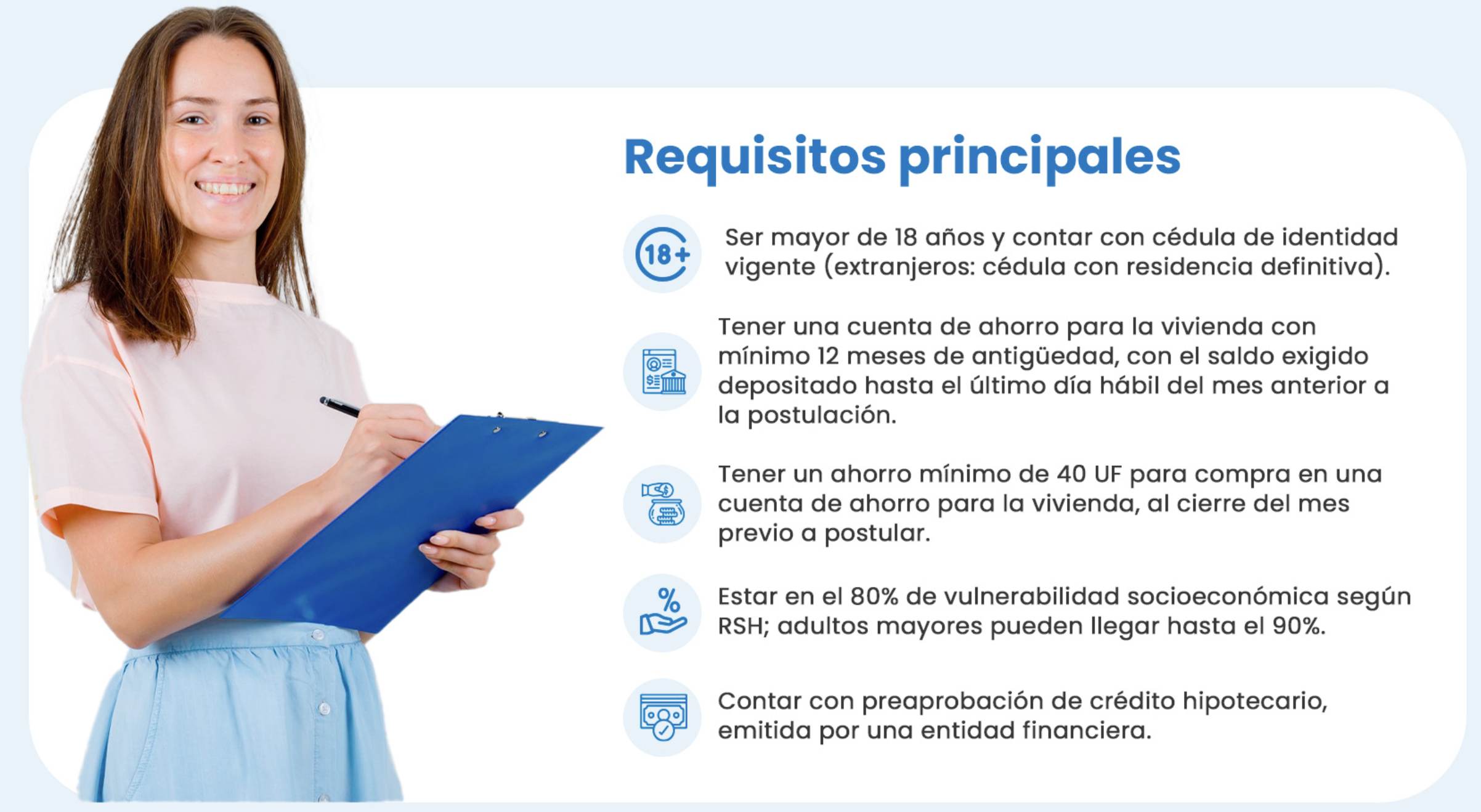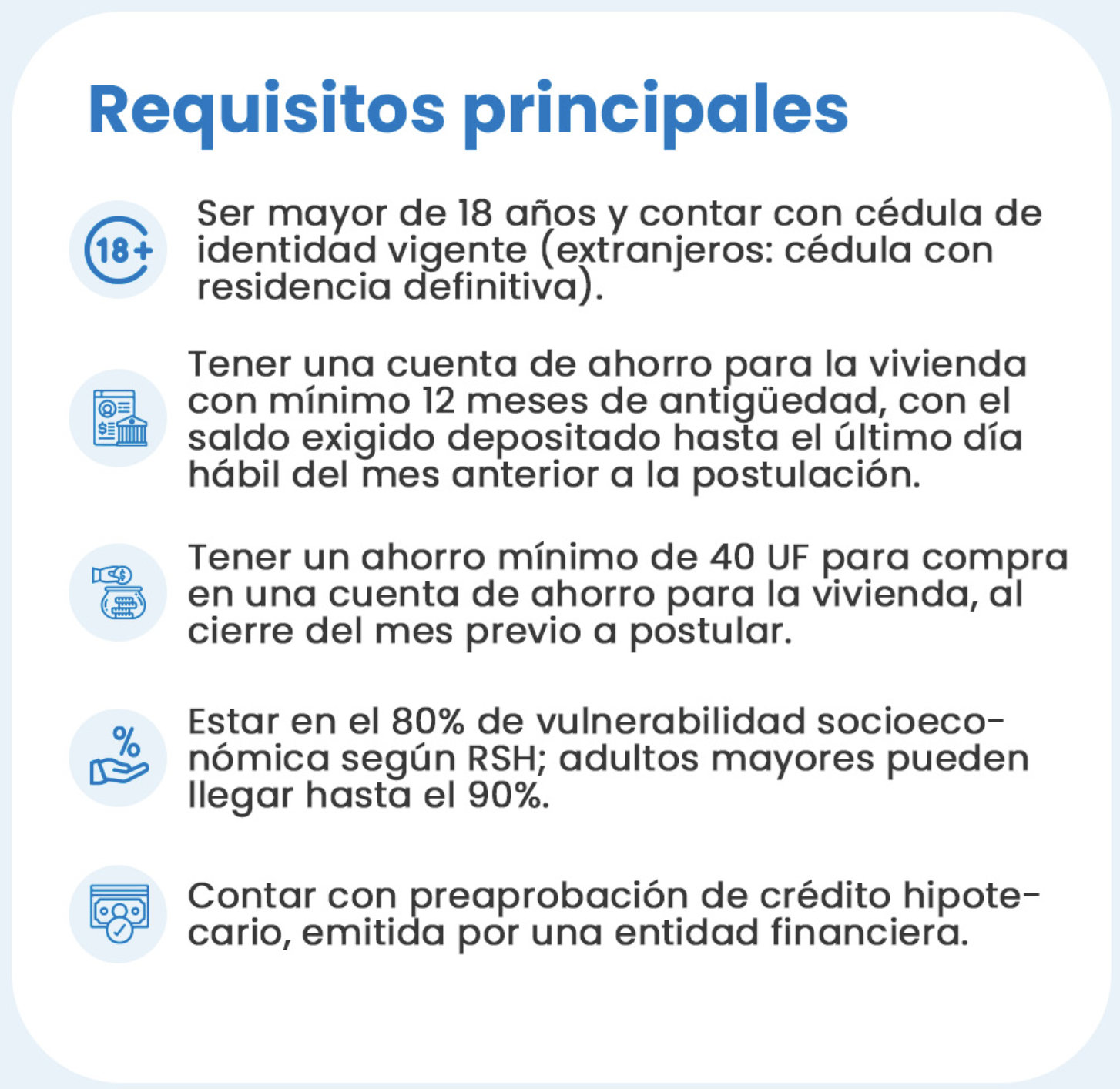 Encuentra tu proyecto compatibleDebes mantener el ahorro por al menos 12 meses previos a la postulación y conservarlo hasta la fecha del proceso.Sí. Puedes complementar con crédito hipotecario siempre que cumplas las condiciones del programa y del banco.Se otorga puntaje adicional presentando la documentación correspondiente en el RSH y cumpliendo los requisitos del llamado.