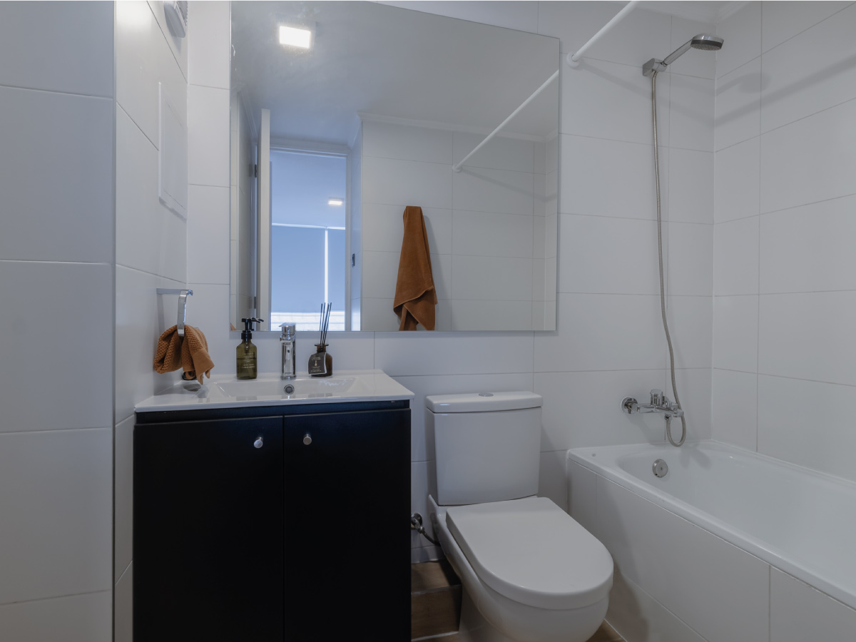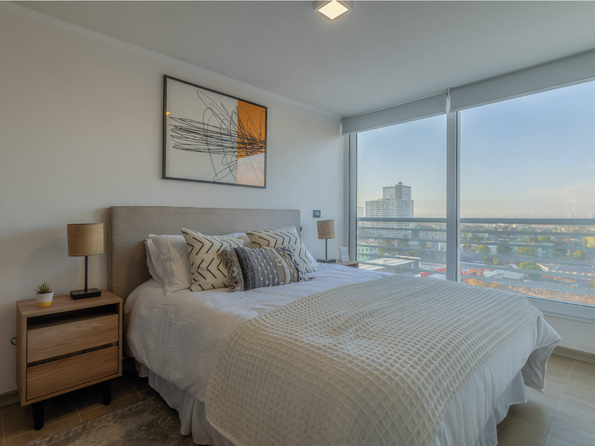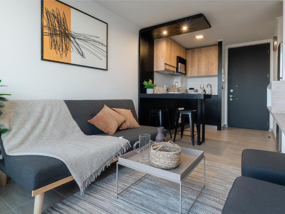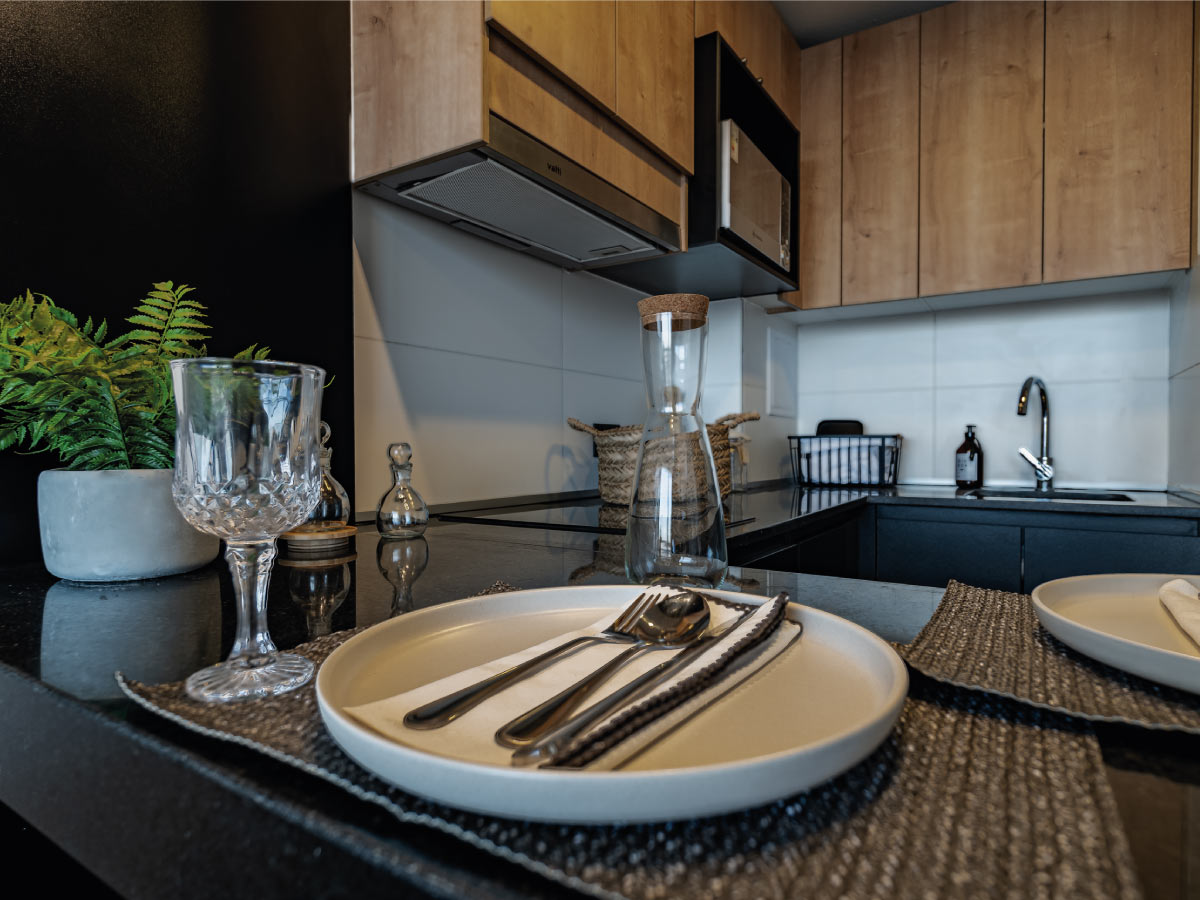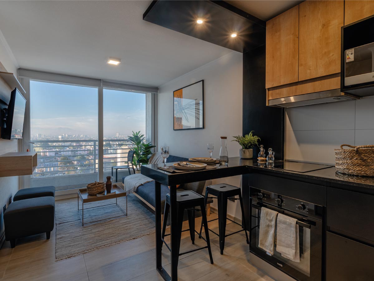 Los departamentos se destacan por sus acabados refinados, como su suelo de gres porcelanato, ventanas de termopanel en marcos de PVC blanco y una cocina equipada con muebles de granito, encimera vitrocerámica, horno eléctrico y campana.