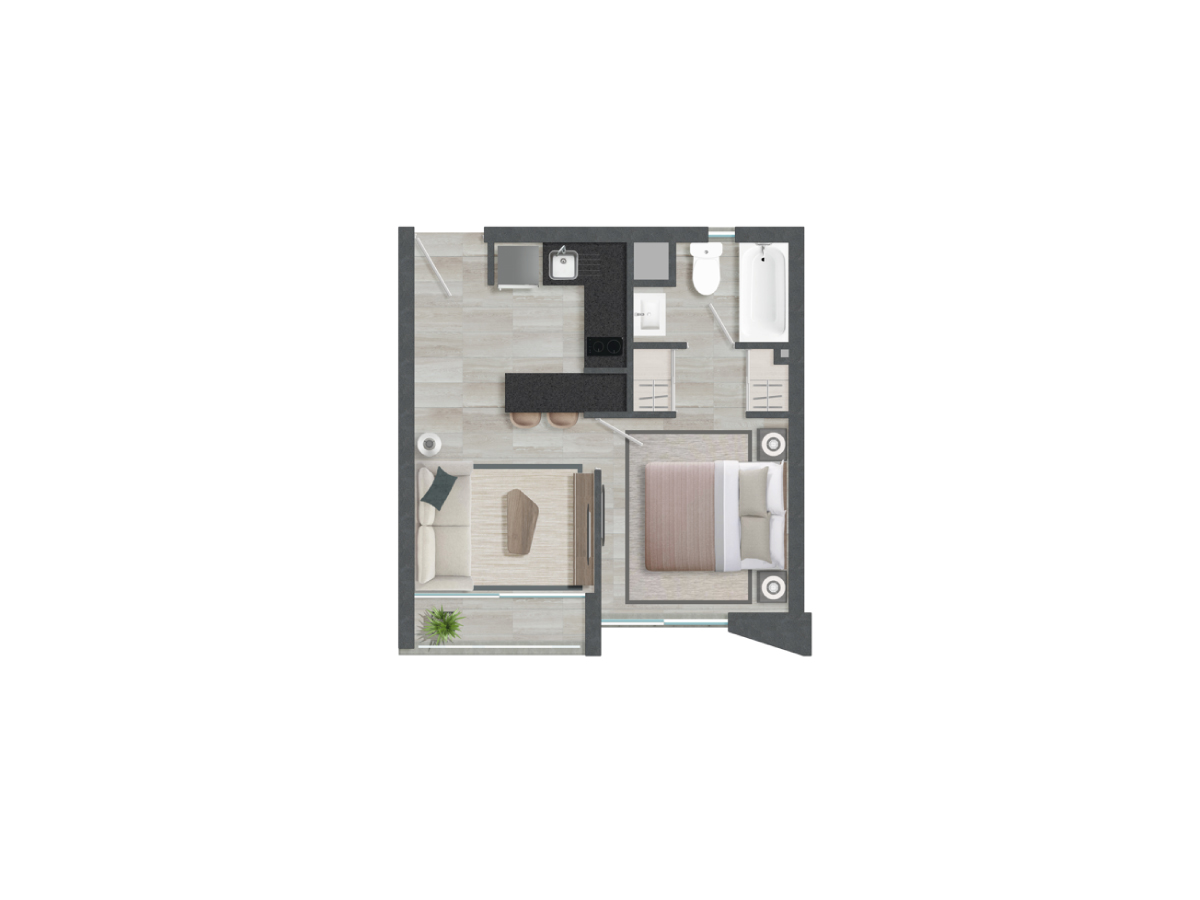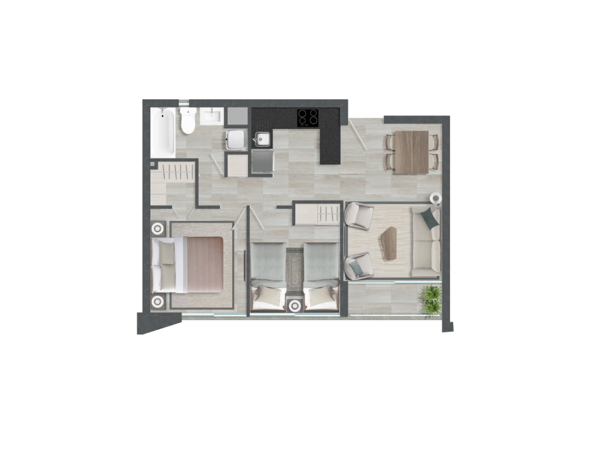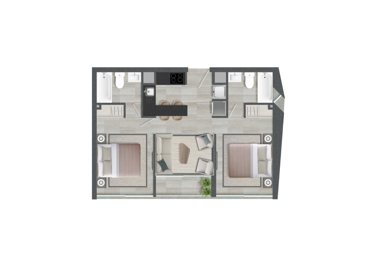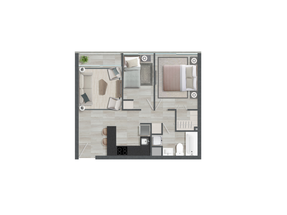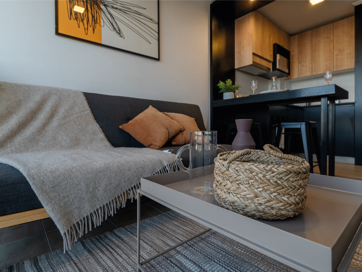 Los departamentos se destacan por sus acabados refinados, como su suelo de gres porcelanato, ventanas de termopanel en marcos de PVC blanco y una cocina equipada con muebles de granito, encimera vitrocerámica, horno eléctrico y campana.