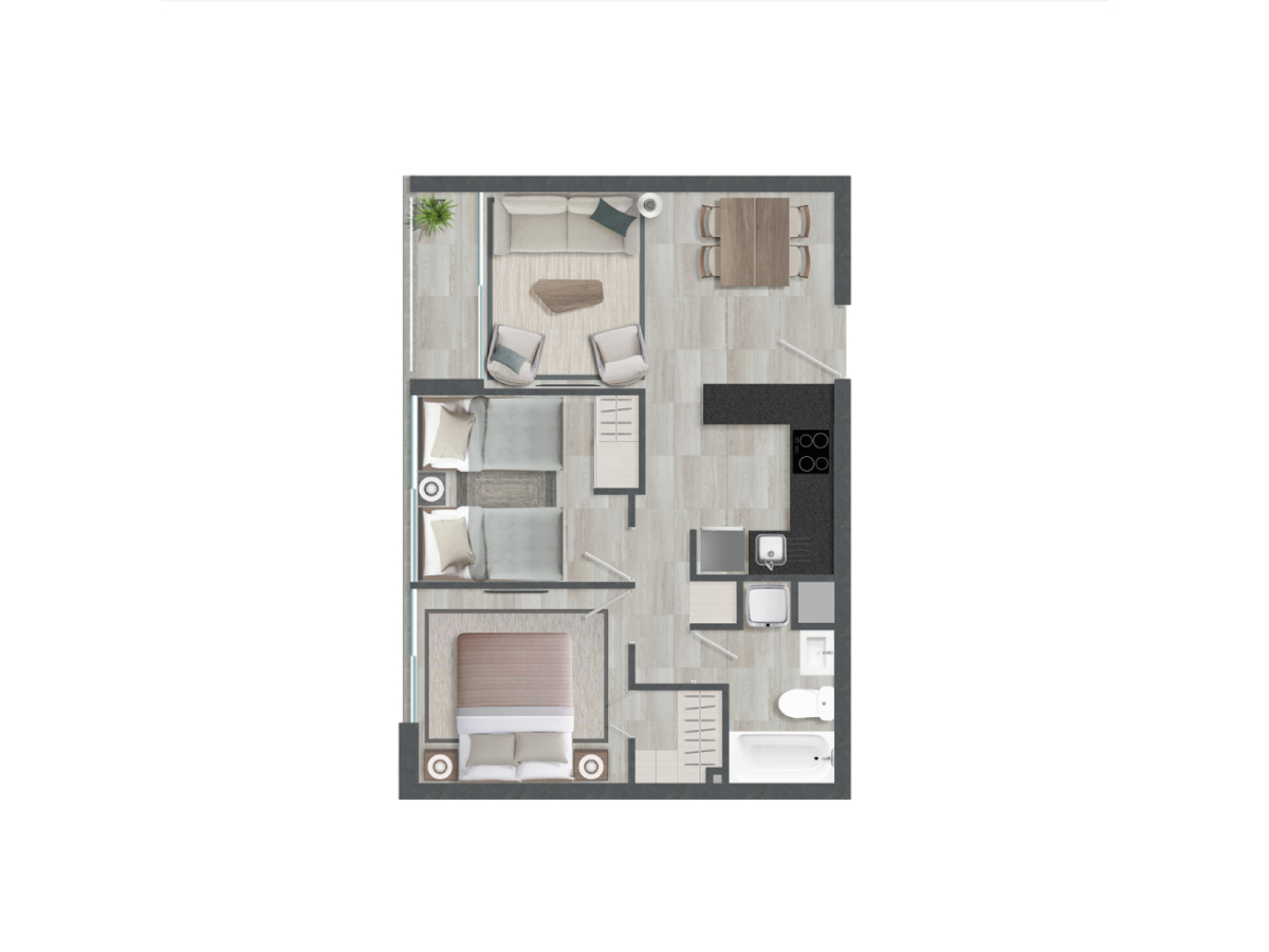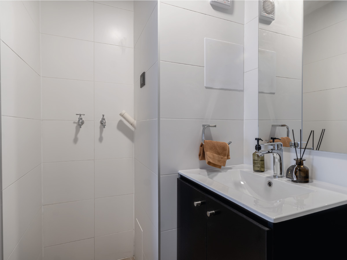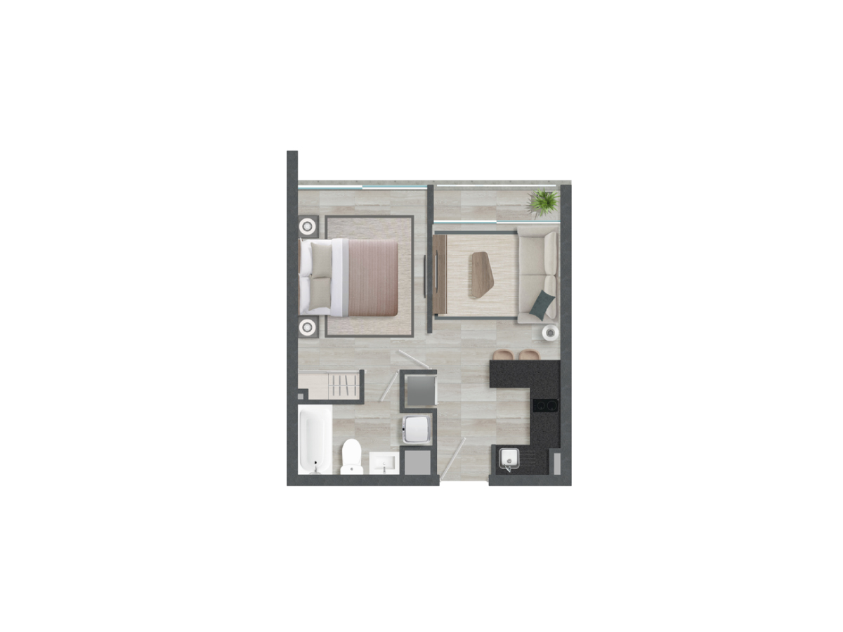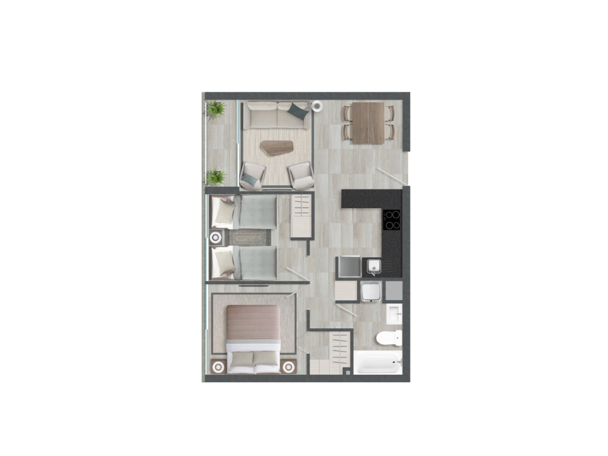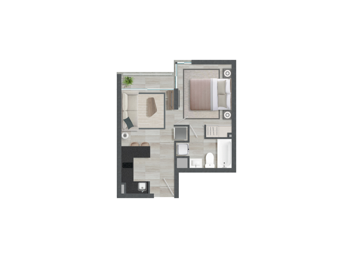 Los departamentos se destacan por sus acabados refinados, como su suelo de gres porcelanato, ventanas de termopanel en marcos de PVC blanco y una cocina equipada con muebles de granito, encimera vitrocerámica, horno eléctrico y campana.