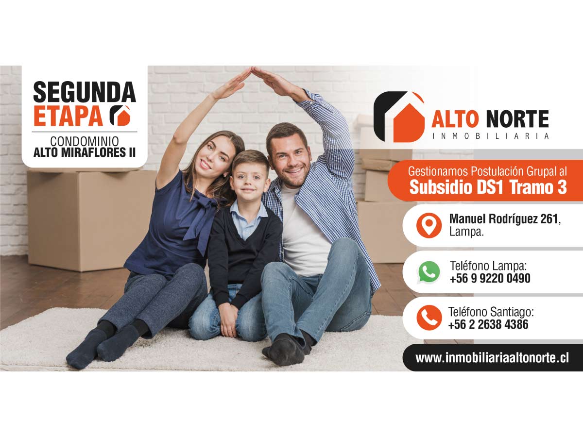 Alto de Miraflores II es un proyecto residencial que te ofrece la oportunidad de vivir en un entorno privilegiado en Lampa. Con 54 viviendas en su segunda etapa, este lugar se destaca por su ubicación estratégica, comodidad y beneficios únicos para ti y tu familia.