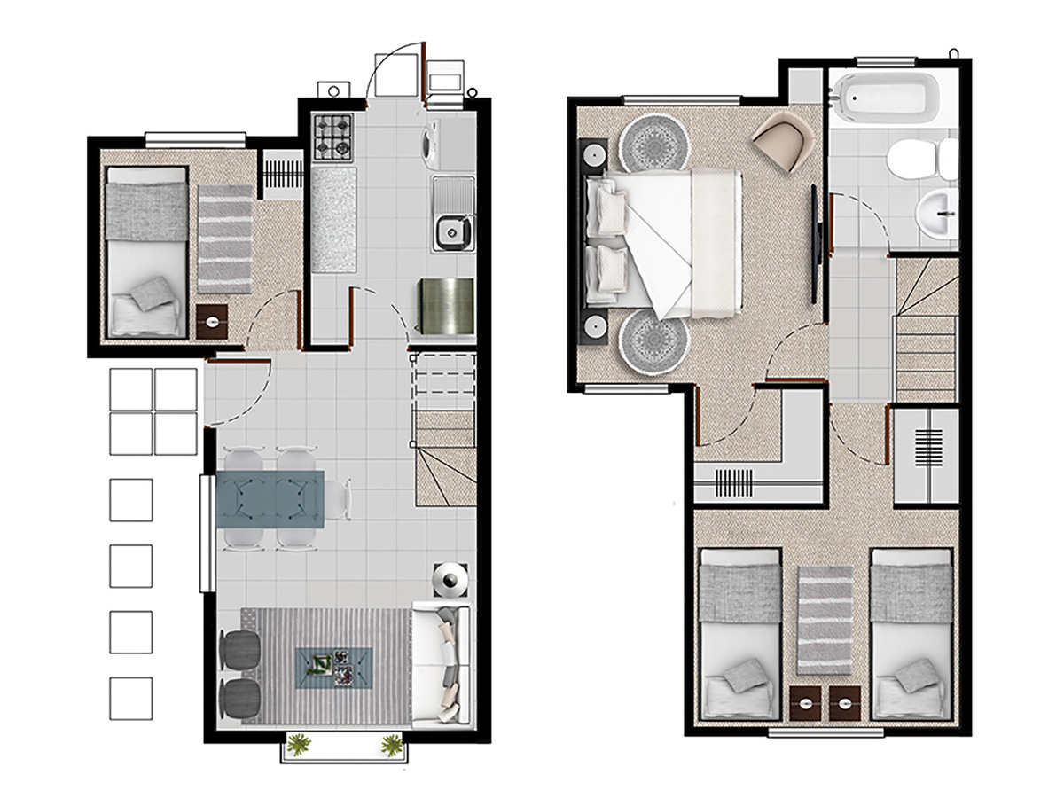 Las casas son de 2 niveles, de 2 y 3 dormitorios, con 1 y 2 baños, ofreciendo una distribución bien pensada para sus residentes.