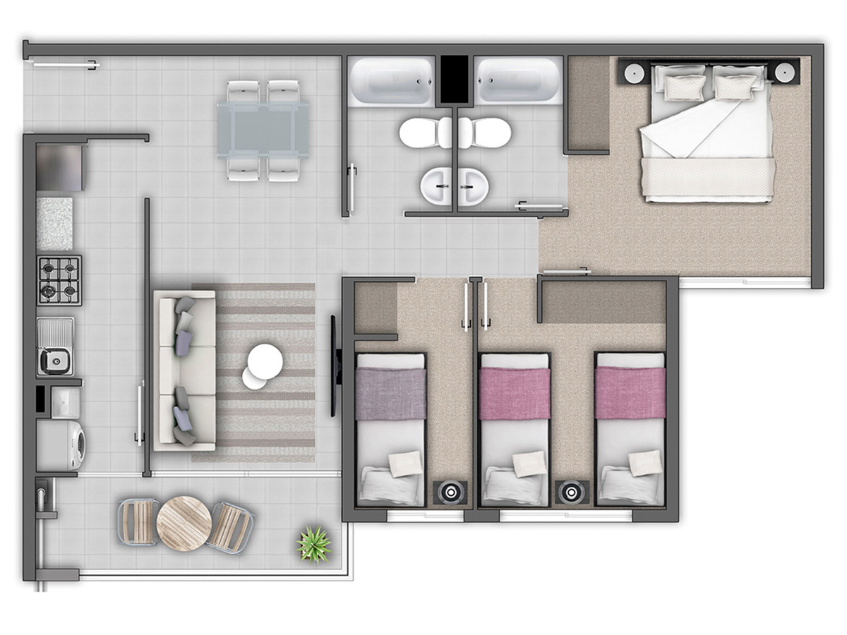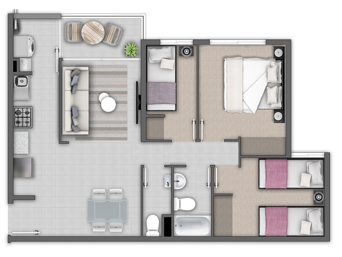 Los departamentos son de 2 y 3 dormitorios, con 1 y 2 baños, ofreciendo una distribución bien pensada para sus residentes. Las terminaciones son de gran calidad. Los pisos de cada unidad contemplan cerámica en living, comedor, cocina, baños, terraza; y los dormitorios, alfombra. Cada departamento cuenta con espacios y conexión para lavadora y calefont. Cabe destacar que en los dormitorios hay ventanas de termopanel haciendo que la vivienda sea más cómoda y agradable para sus habitantes.