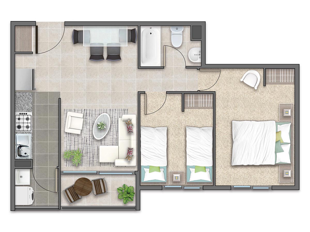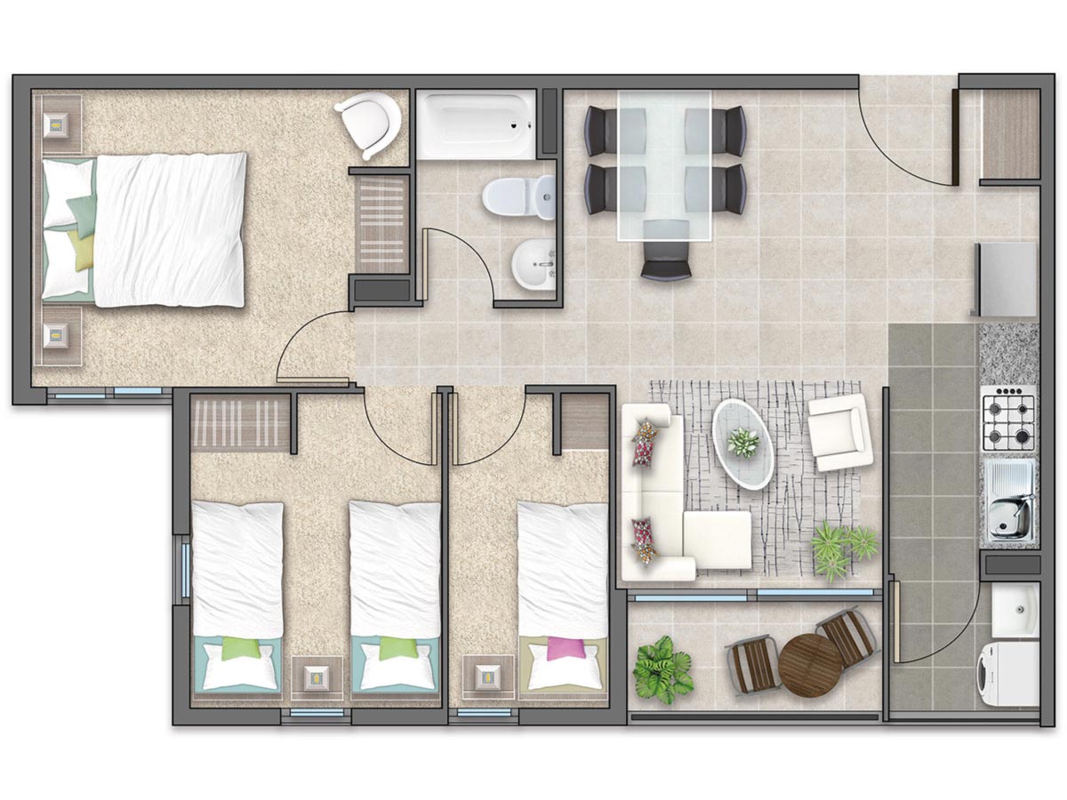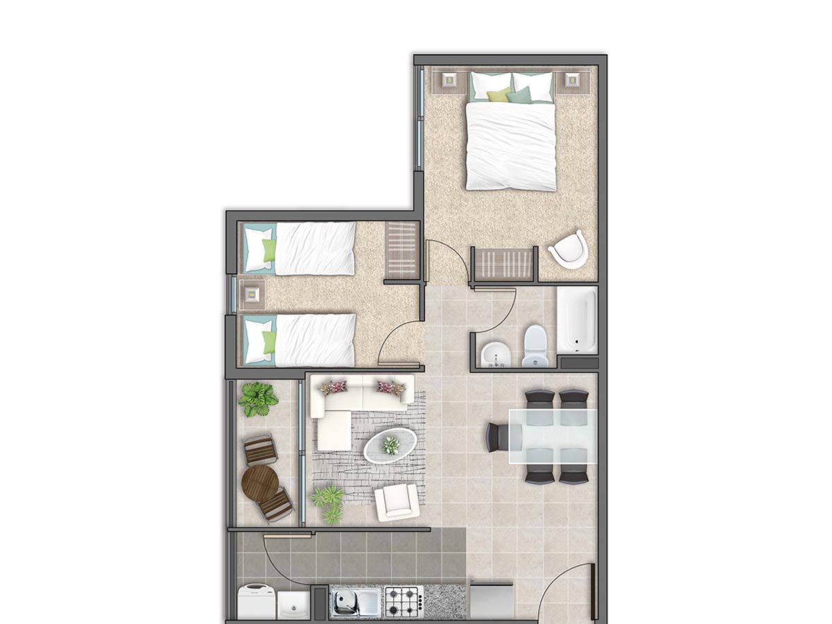 Condominio Titán 2 cuenta con 240 departamentos de entre 56,40 m² y 61,61 m² útiles, con opciones de 2 y 3 dormitorios diseñados para satisfacer diversas necesidades familiares. Cada espacio está pensado para ofrecer funcionalidad y confort, convirtiendo cada momento en casa en uno de disfrute y tranquilidad.