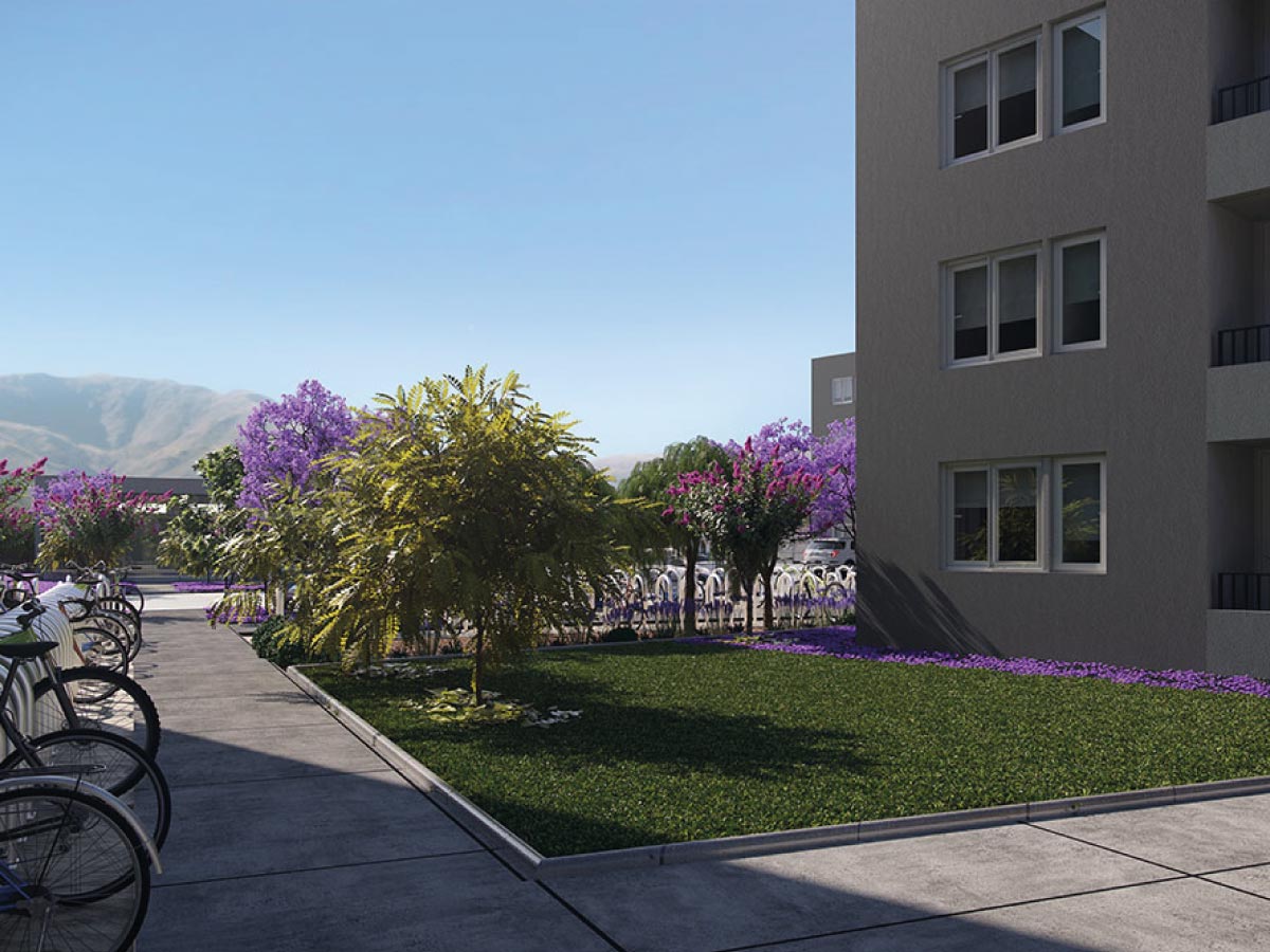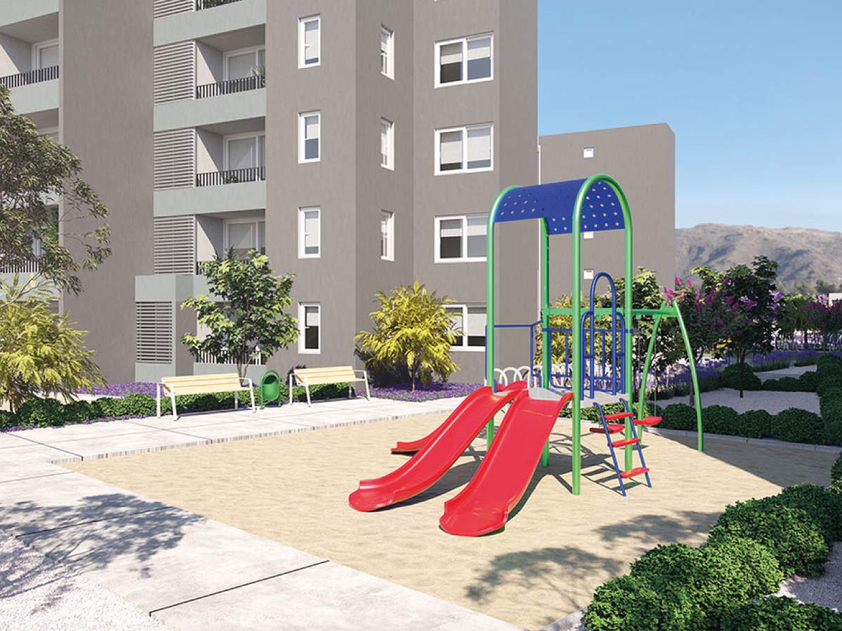 El proyecto se distingue por sus áreas comunes, que incluyen una sala multiuso y extensas áreas verdes de 1.405 m² con juegos para niños, equipos de ejercicio y un sendero para correr, todo dentro de un entorno seguro y privado. Además, la construcción cuenta con aislación térmica en sus muros, mejorando la eficiencia energética y el confort.