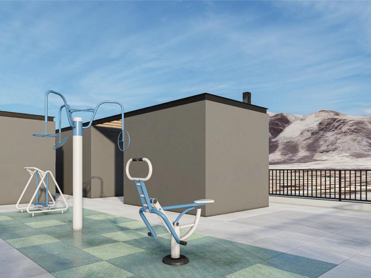 Nuestro edificio cuenta con 3 ascensores para tu comodidad. Además, disfruta de una plaza interior y zona de juegos infantiles, áreas deportivas con máquinas de ejercicios, quinchos, sala multiuso y bicicleteros.