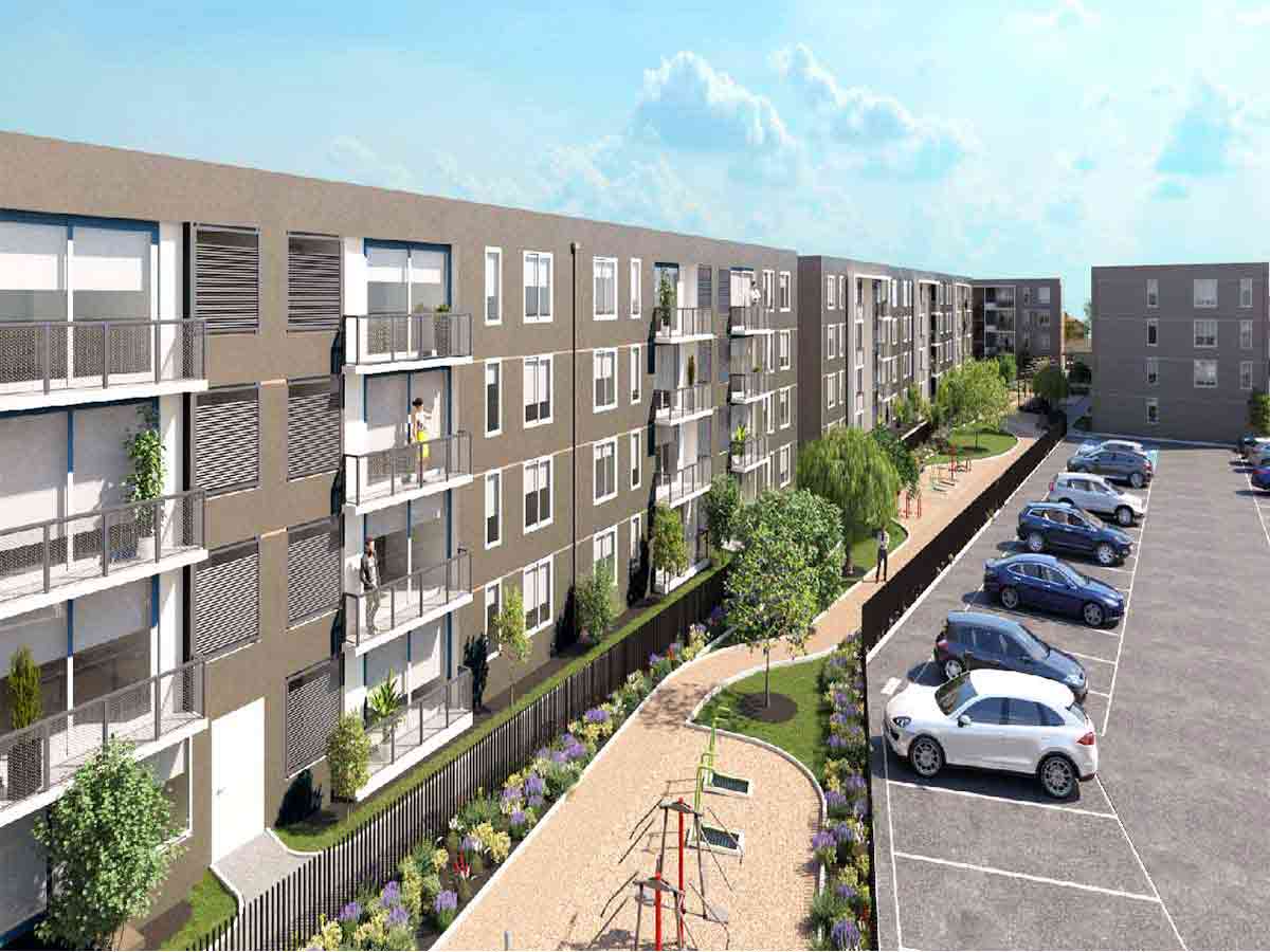 142 departamentos de 2 Dormitorios 2 Baños y 3 Dormitorios 2 Baños. Condominio con accesos controlados las 24 Horas, Quinchos, Sala Multiusos, Areas verdes, Juegos de Niños. Estacionamientos Subterraneos y de superficie, Locales Comerciales.