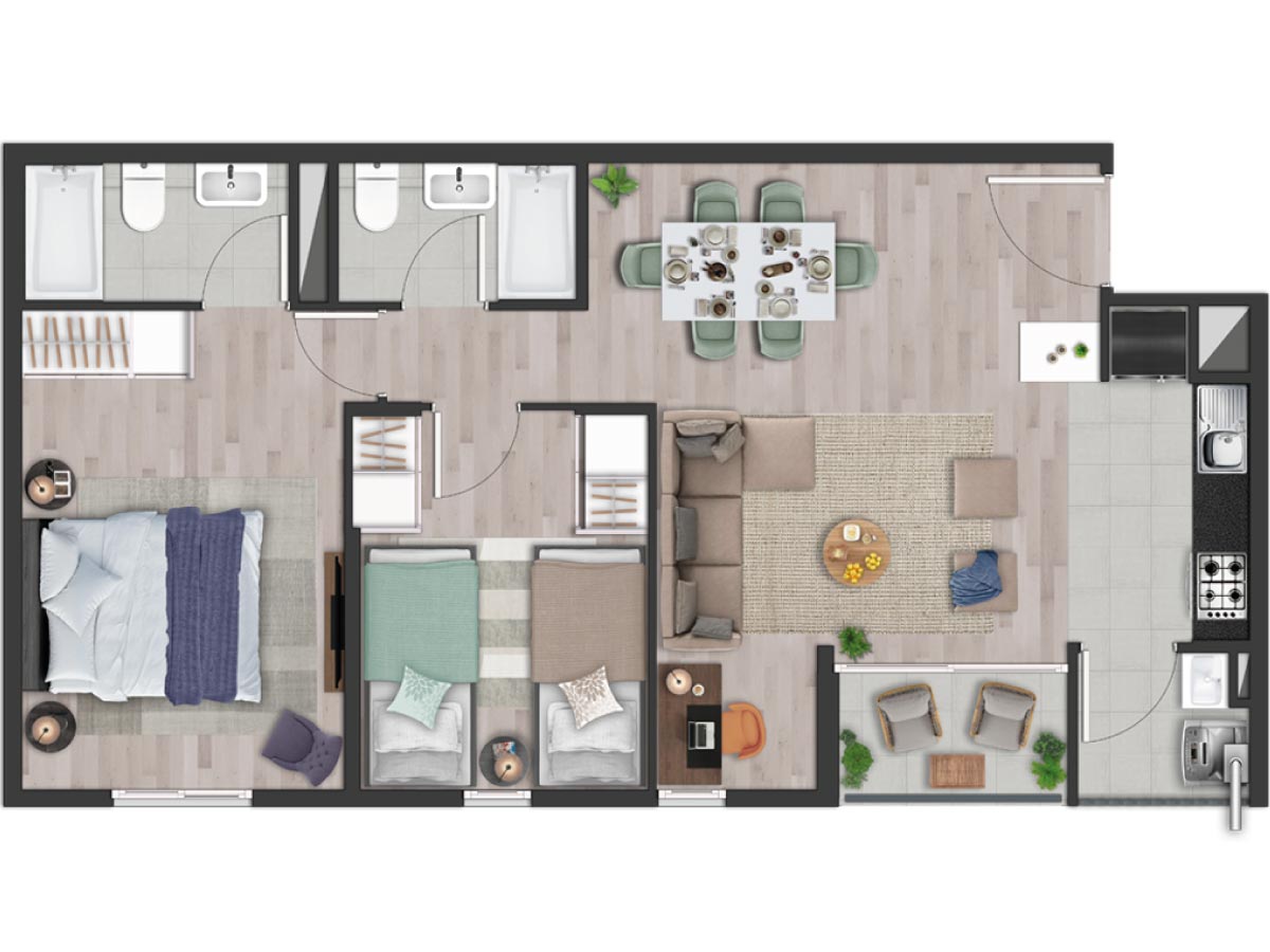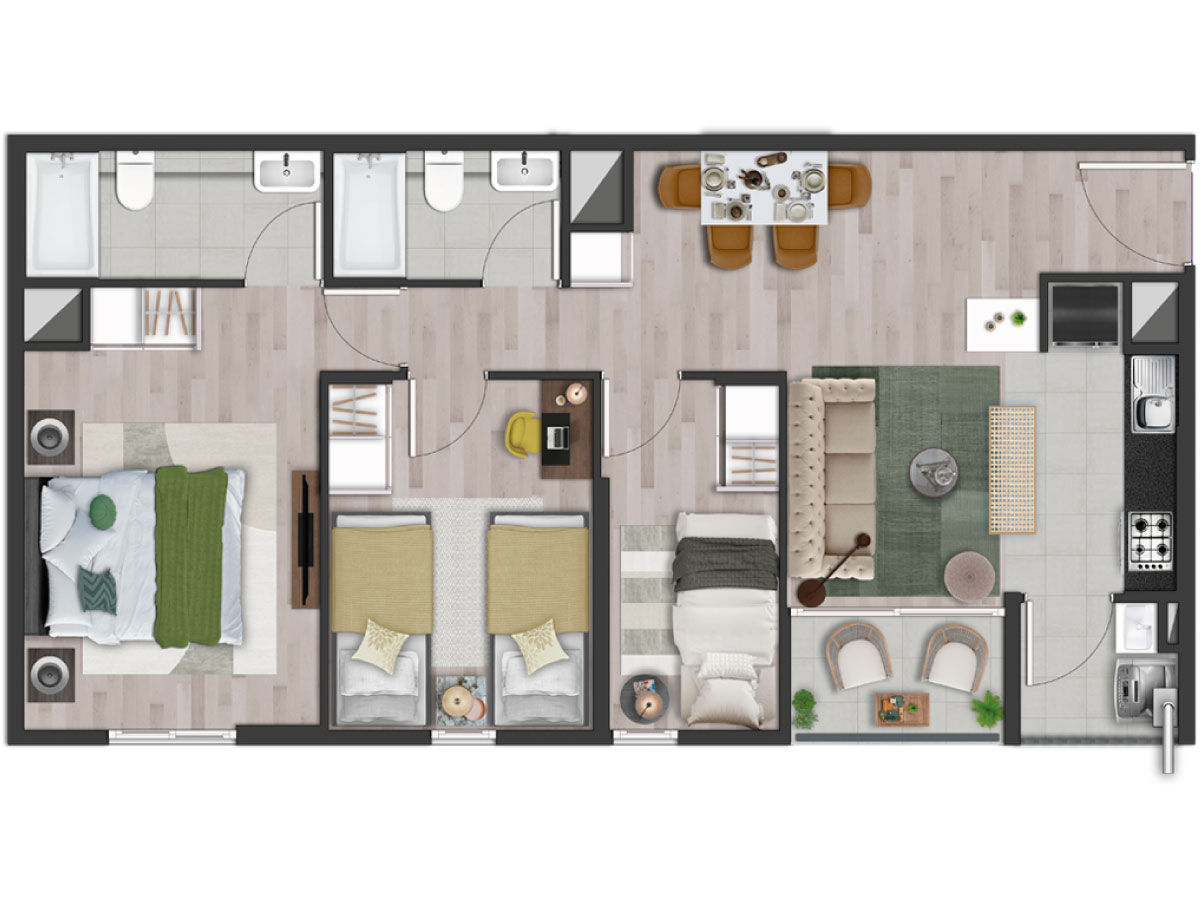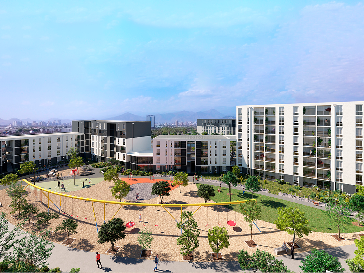 Un concepto único en Chile de arquitectura y diseño urbano sustentable que favorece el encuentro y la integración de sus habitantes. Con amplias y grandes areas de infraestructura verde en patios y circulacion central para disminuir temperaturas y aperturas en direccion de los vientos entre cada conjunto permiten ventilar desde el interior del complejo.