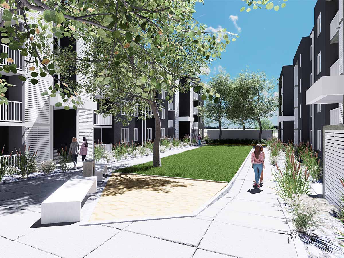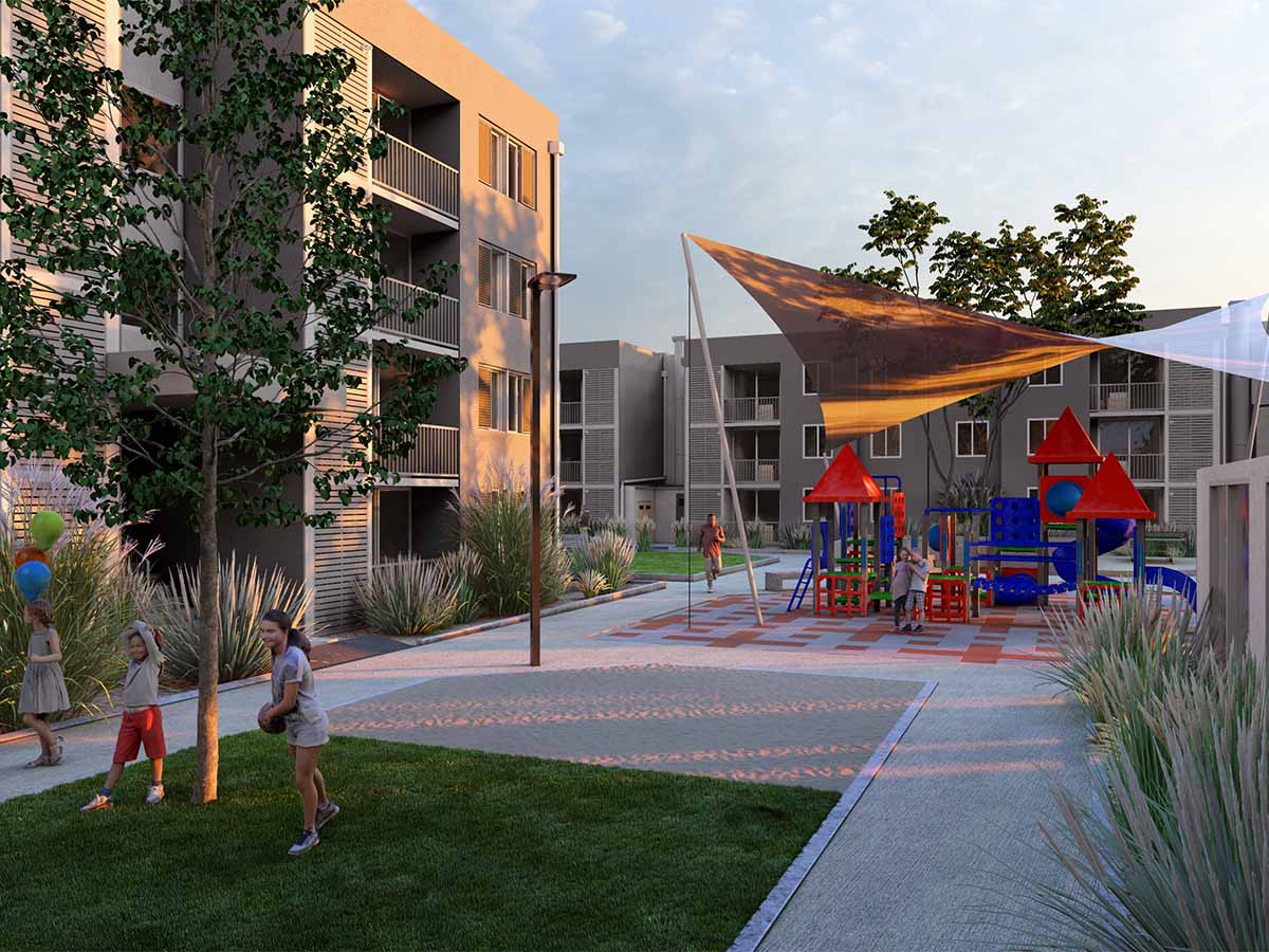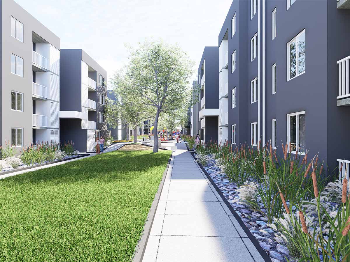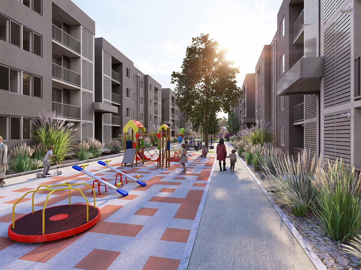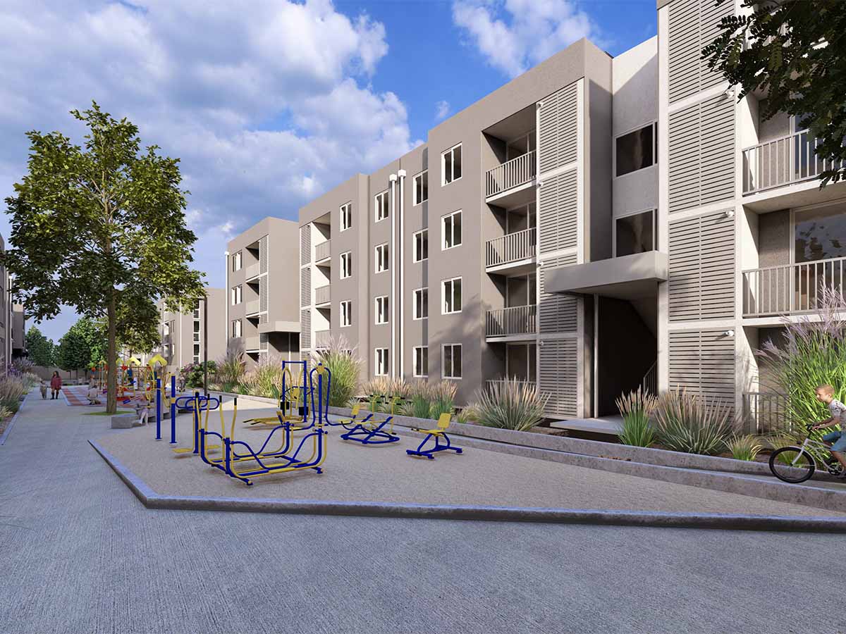 El proyecto contempla 7 edificios de 4 pisos, organizados en torno a un amplio corredor central que conecta zonas comunes de alto estándar. Se desarrollan 210 departamentos de 2 y 3 dormitorios, con un diseño arquitectónico contemporáneo, eficiente y acogedor.
